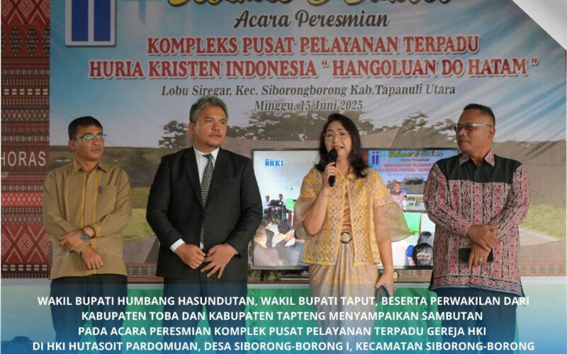Tapraya.com, Humbahas – Wakil Bupati Humbang Hasundutan, Junita Rebeka Marbun, SH, MAP hadiri peresmian Komplek Pusat Pelayanan Terpadu Huria Kristen Indonesia (HKI) “Hangoluan Do Hatam” Lobu Siregar bertempat di Sopo Godang Gereja HKI Hutasoit Pardomuan, Desa Siborong-Borong I, Kecamatan Siborongborong, Kabupaten Tapanuli Utara, Minggu, 15 Juni 2025.